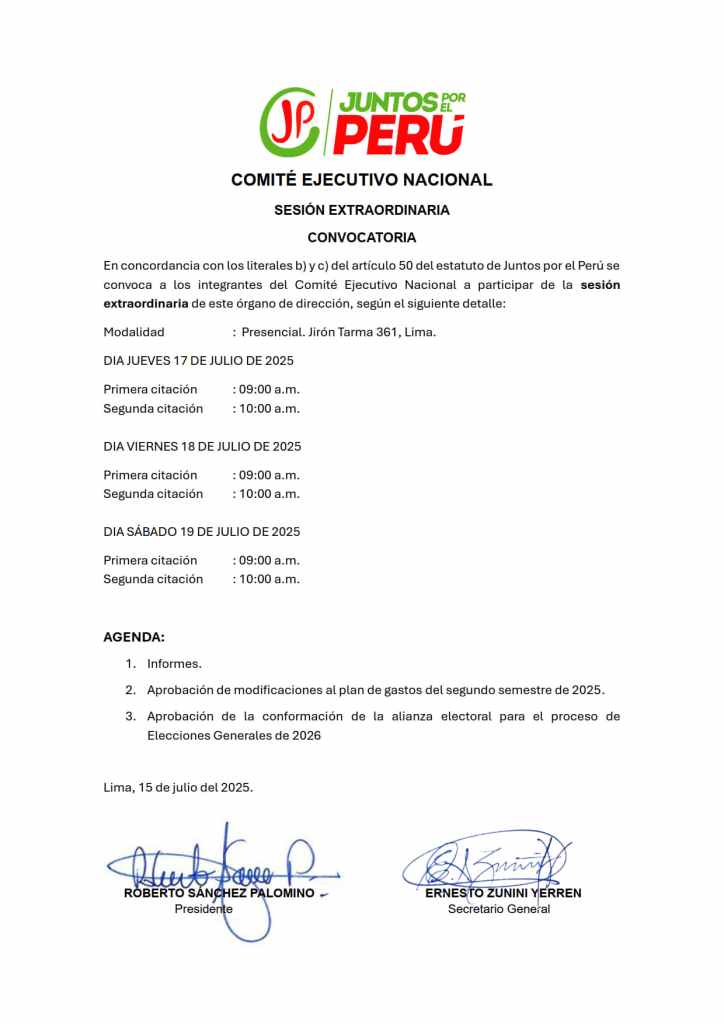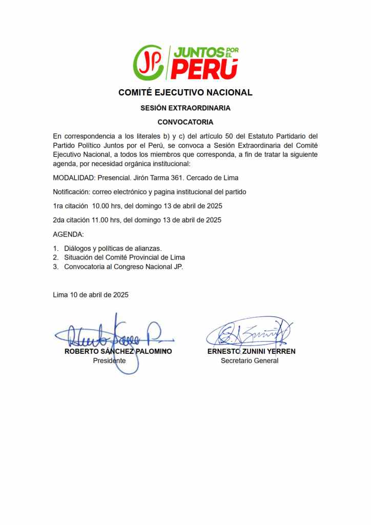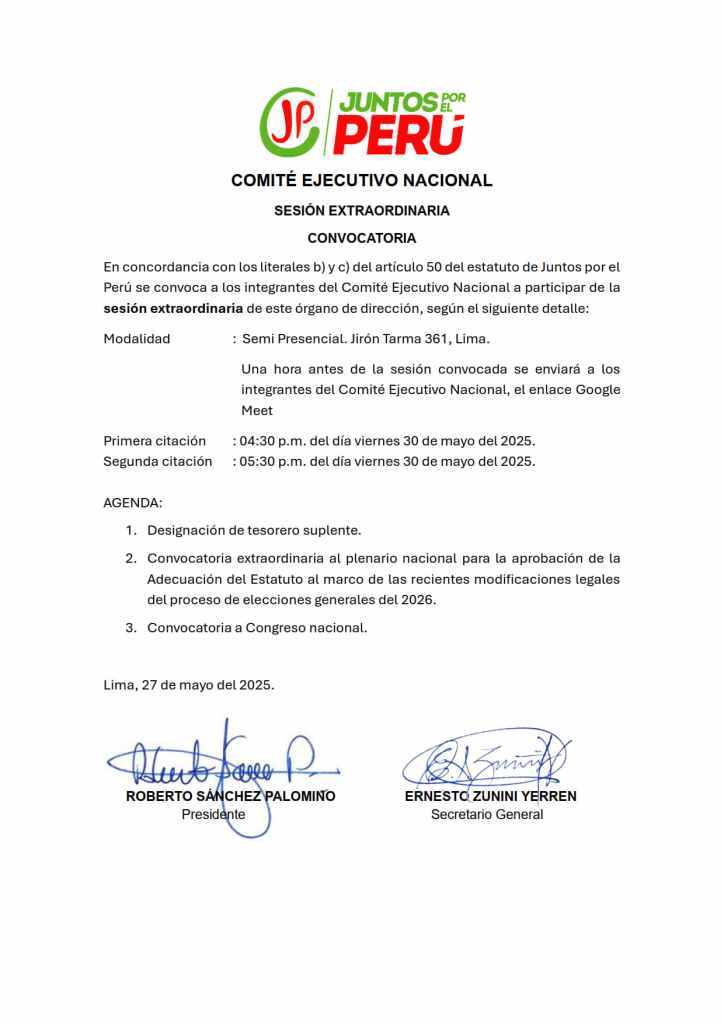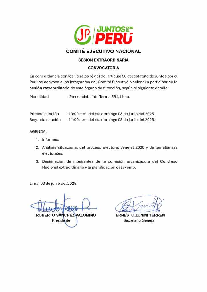 Convocatoria de sesión extraordinaria del Plenario Nacional del 08 de junio de 2025